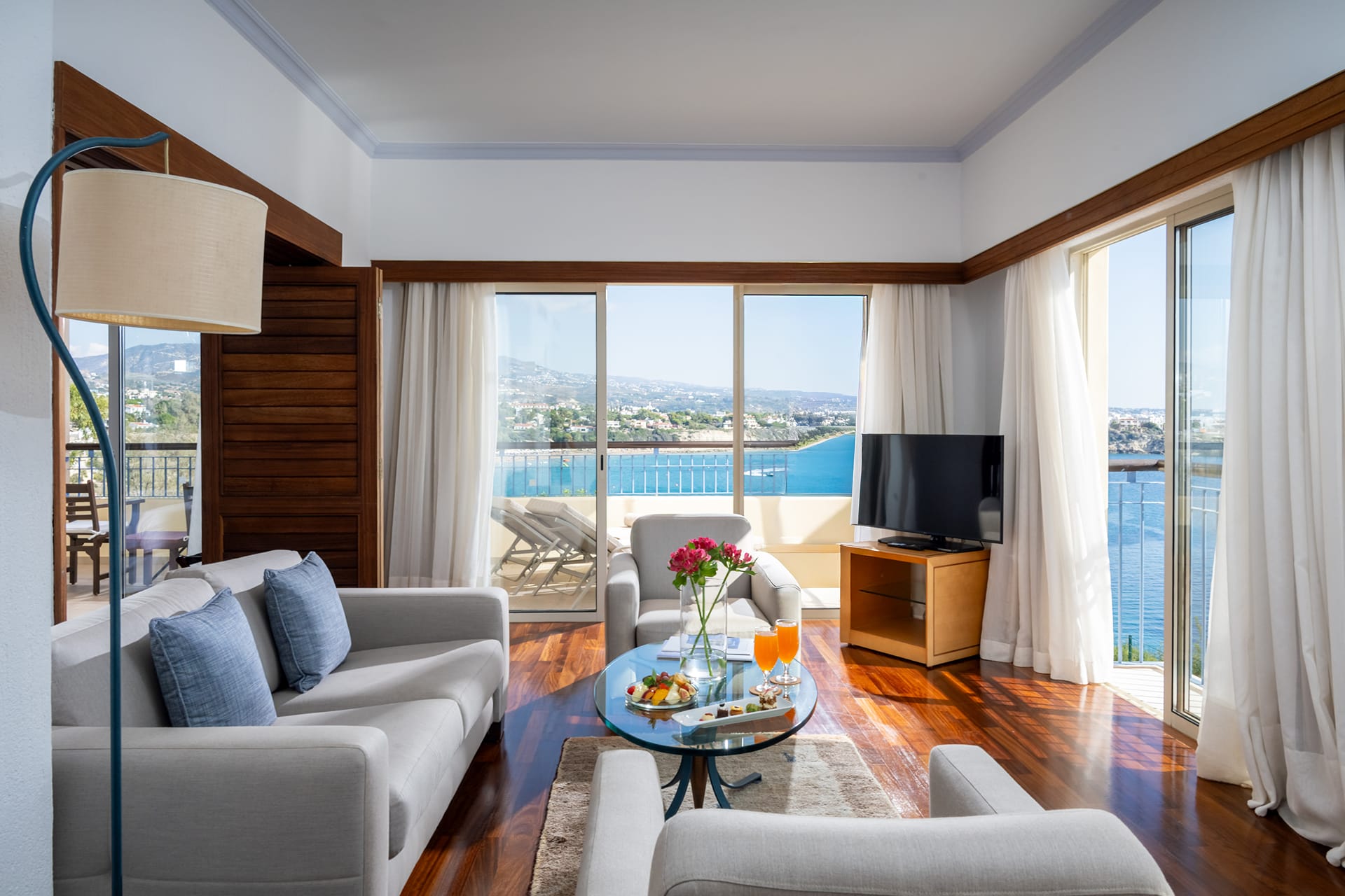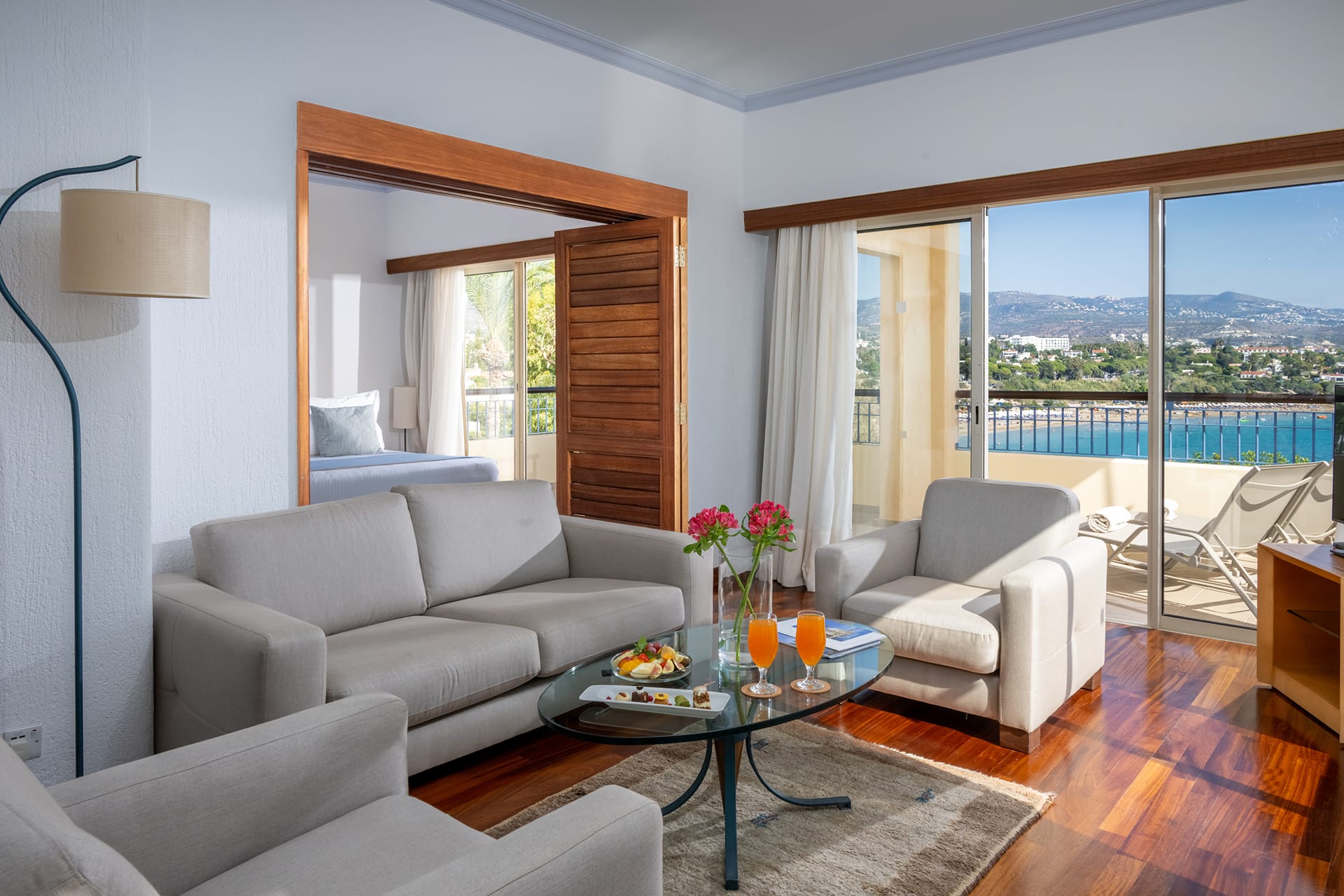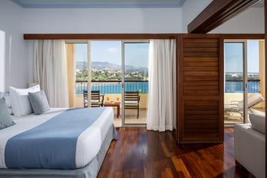 This Suite can accommodate comfortably up to two guests in room space of 60m2 with relaxing sea view and consists of living room separate bedroom and a spacious bathroom.